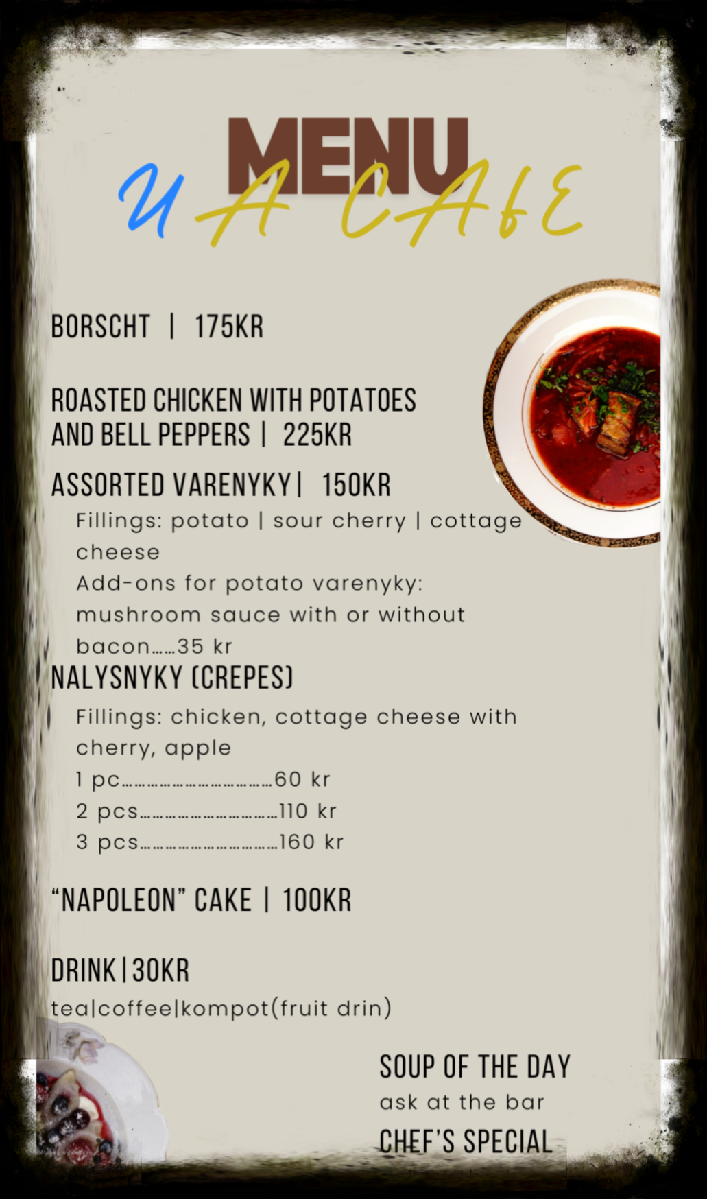 Missa inte vår Chef Special - det bästa man kan äta, och våra klassiker Borsch och Varenyky. Glöm inte att spara plats för våra fantastiska desserter som avslutar din måltid på bästa sätt. Till varje rätt erbjuder vi ett noga utvalt sortiment av ukrainska drycker, inklusive öl, cider, vin och snaps.