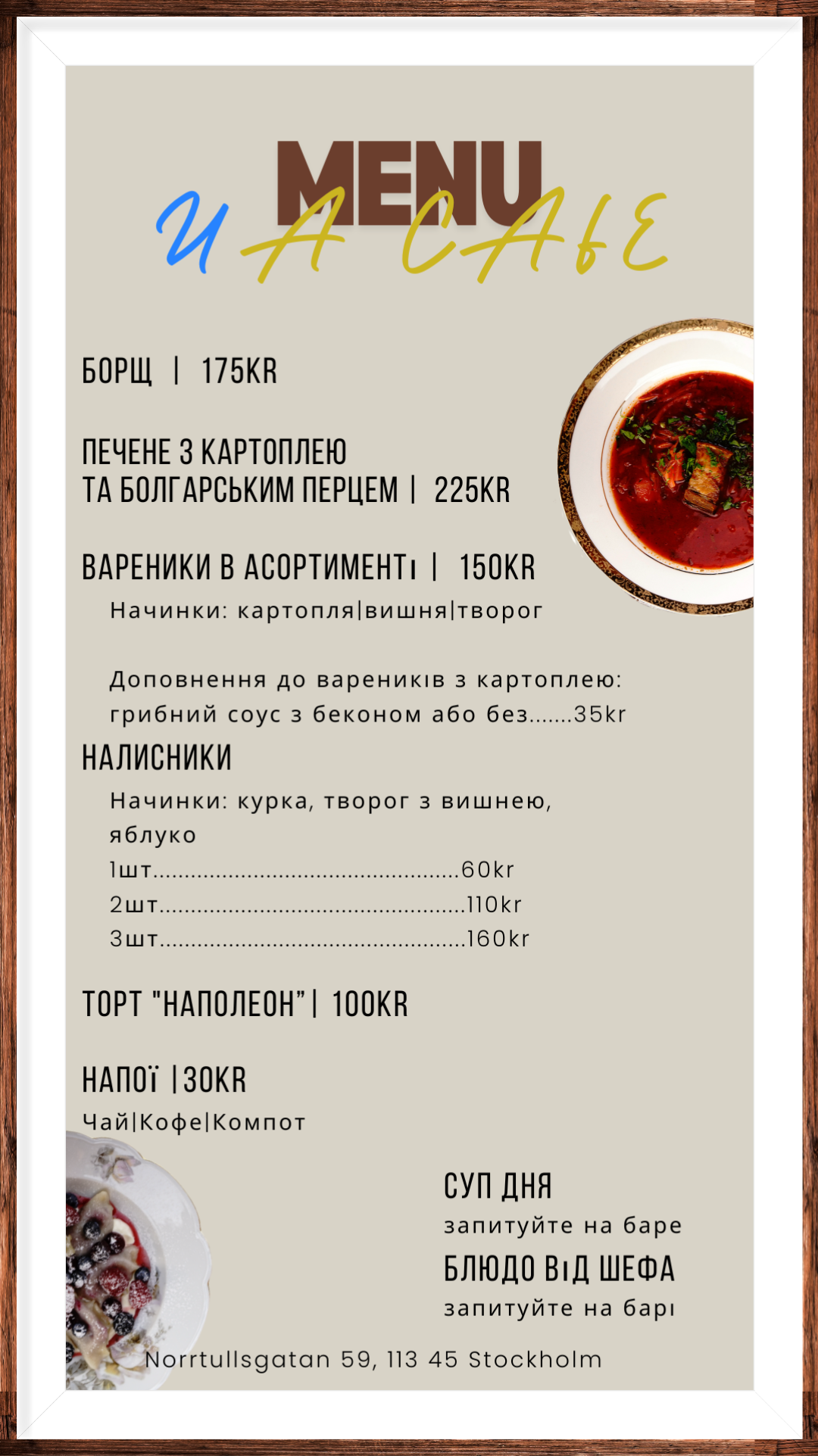 Vår meny speglar det bästa av ukrainsk mat – från klassiska rätter som borsjtj och varenyky till moderna tolkningar av traditionella favoriter. Som ukrainsk restaurang och kafé strävar vi efter att skapa en autentisk men nyskapande matupplevelse där historia, smak och nutid möts.